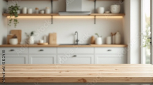 © Studio VIP, Fototapeta premium A clean wooden kitchen table with a sharp focus in the foreground, with a modern minimalist kitchen faintly visible in the background.