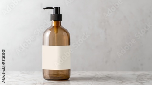 © ai, Naklejka premium A clear brown glass bottle with a black pump dispenser stands on a light grey marble surface,