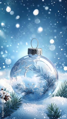 © Liu, Fototapeta premium A clear Christmas ornament with snowflakes and pine branches on a snowy background