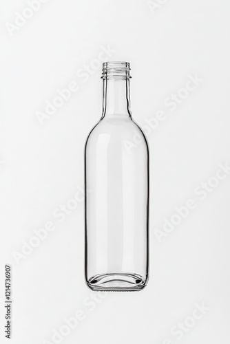 © UnderTheSun, Fototapeta premium A clear, empty glass bottle stands upright against a plain background, showcasing its sleek design and smooth contours, perfect for packaging beverages.