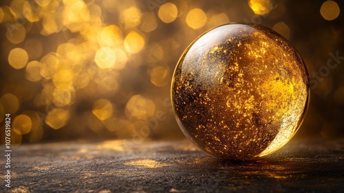 Fototapeta premium A clear glass ball sits atop a simple wooden table, waiting for something to...