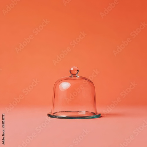 © A4719, Obraz premium A clear glass dome cloche with a handle rests on a pink surface. The background is a solid coral color.