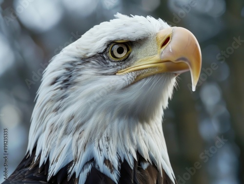 Fototapeta premium A clear image of a bald eagle's face with a blurred background