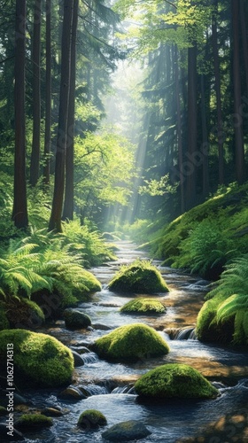 © Syahrul Zidane A, Obraz premium A clear mountain stream winding through a dense pine forest