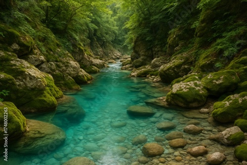 Fototapeta premium A clear river flows through a lush, green gorge, offering a serene view