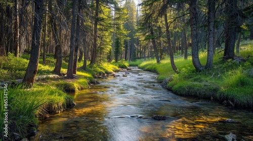 Fototapeta premium A clear stream winding through a peaceful forest with tall trees