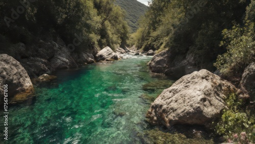 Naklejka premium A clear, turquoise river flows through a rocky gorge, surrounded by lush...