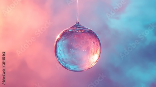 Fototapeta premium A clear water droplet floating mid-air against a gradient background,...
