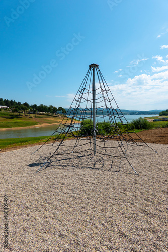© tonysk, Fototapeta premium A climbing frame on a children's playground, in the background you can see the Domaša reservoir with a lack of water