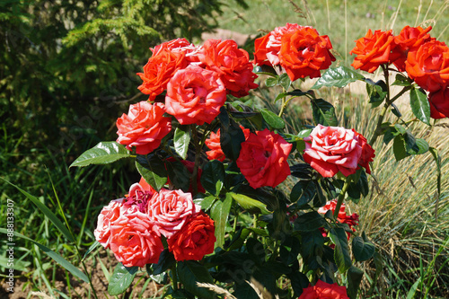 © ovcerleonid, Fototapeta premium A climbing rose grows in the garden on a flower bed