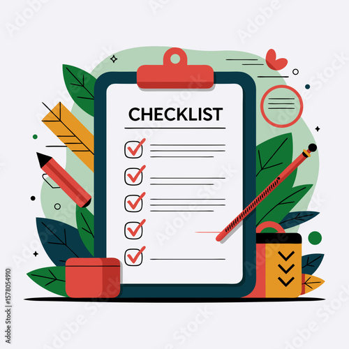 © SA7, Fototapeta premium A clipboard with a checklist, completed tasks marked with red checkmarks, surrounded by decorative leaves and elements.