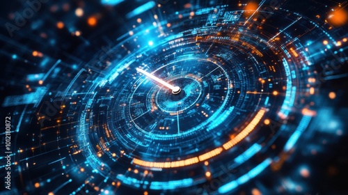 © Валерий Тодаренко, Obraz premium A clock surrounded by abstract digital symbols, representing time management and technological advancements in optimizing thinking processes.