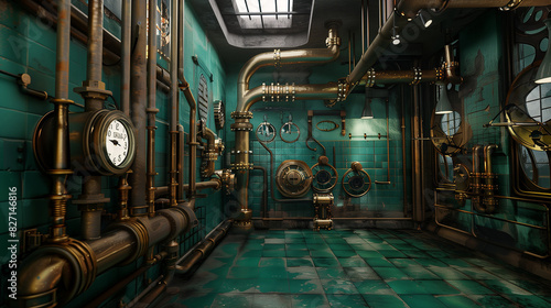 Fototapeta premium A clock with roman numerals is mounted on a wall in a room with pipes and valves