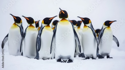 © Ariestia, Obraz premium A Close Formation Of Penguins Staring Upward In The Snowy Scene