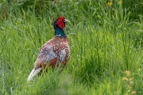Fototapeta premium A close portrait of a male pheasant, Phasianus colchicus, as he stands in the grass looking alert