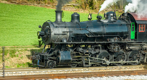 Naklejka premium A Close Side Aerial View of a Steam Engine Waiting, all Steamed Up, While it...