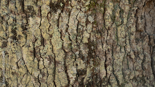 © carlos, Naklejka premium A close-up and detailed shot of the rough bark of a tree. The surface features deep cracks, intricate patterns, and a variety of brown, gray, and green hues, with moss or lichens