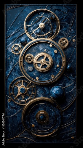 © Angghu, Naklejka premium A close-up, detailed view of interlocking golden clockwork gears and mechanisms against a dark blue, marbled textured background. The lighting is dramatic and h