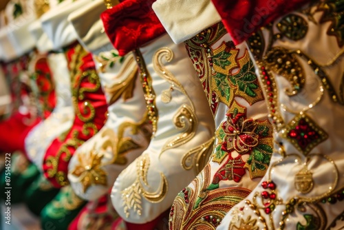 Fototapeta premium A close-up illustration of intricately designed Christmas stockings, perfect...