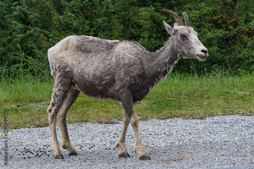 © Valerii, Naklejka premium A close-up image of a curious goat standing on a rocky terrain, showcasing its unique features and natural habitat within a lush green environment.