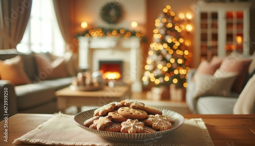 Fototapeta premium A close-up image of a gingerbread cookie, soft-focus festive lights in the...