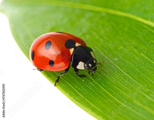 © imus, Fototapeta premium A close-up image of a ladybug on a vibrant green leaf, perfect detail