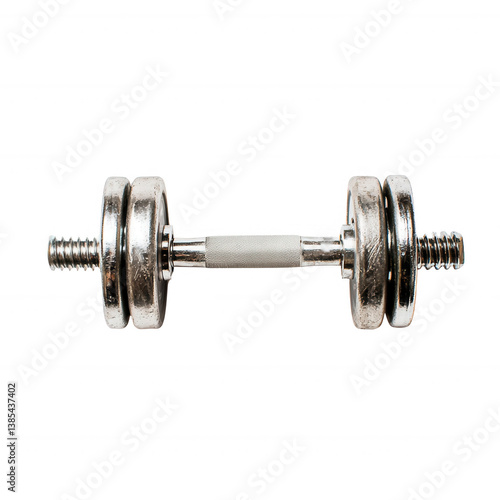 © kiimoshi, Fototapeta premium A close-up image of a silver dumbbell on a transparent background, showcasing its sleek design and shiny surface, ideal for fitness and gym-related content.