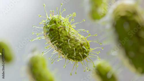 © Aleksandra, Naklejka premium A close-up image of a single microbe isolated on a white background, with a shallow depth of field highlighting its intricate details. The blurred background enhances the focus on the microbe