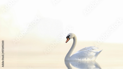 Obraz premium A close-up image of a single swan floating in calm waters, light background