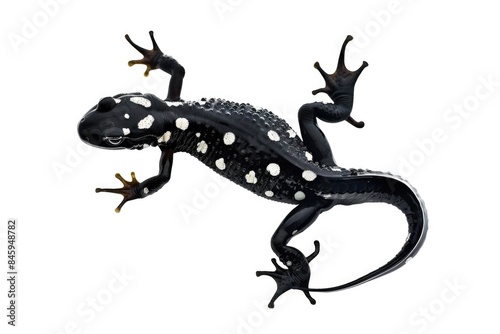 © Fotograf, Fototapeta premium A close-up image of a small black and white spotted lizard sitting on a white background, looking straight ahead