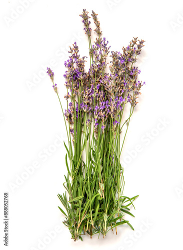 © Mentor56, Naklejka premium A close-up image of a tied bouquet of fresh lavender flowers, isolated against a white background.