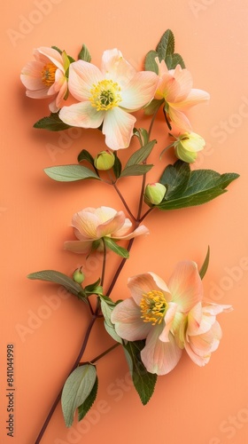Fototapeta premium A close-up image of delicate peach blossom flowers with green leaves against a peach colored wallpaper background
