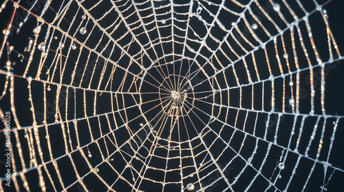 © Aditya, Fototapeta premium A close-up, intricate spider web covered in frost and dew drops, illuminated by soft golden light against a dark background.