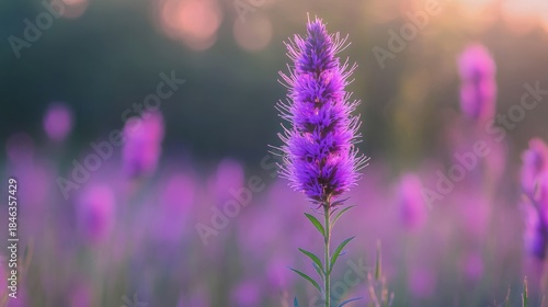 Fototapeta premium 109.A close-up macro shot of a single Meadow Blazing Star, showcasing the intricate, feathery texture of its vibrant purple petals, with a blurred meadow of flowers in the background.