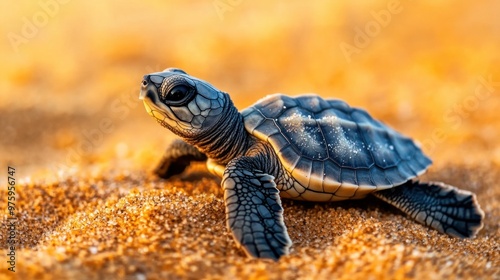 © Napasnan, Obraz premium A close-up of a baby turtle's tiny feet and shell as it crawls across the sand