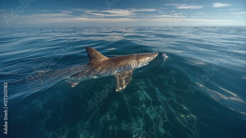 Naklejka premium A close-up of a basking shark’s silhouette against the bright sunlit water...