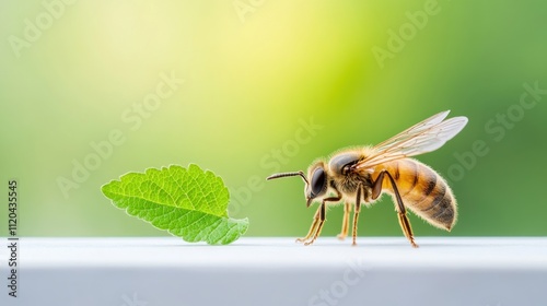 © Edo, Fototapeta premium A close-up of a bee beside a green leaf on a blurred background.