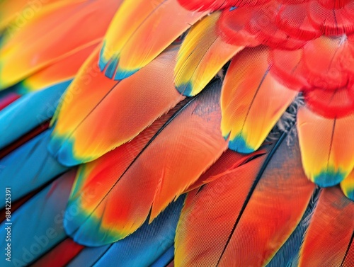 © Dalibor, Obraz premium A close up of a bird's colorful feathers, with a mix of red, blue.