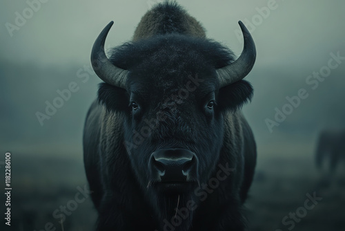 Naklejka premium A close-up of a bison in a misty landscape, showcasing its powerful presence.