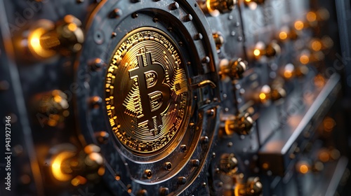 Fototapeta premium A close-up of a Bitcoin symbol on a metallic vault door, symbolizing...