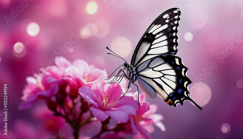 © MDMAHBUBUR, Naklejka premium A close-up of a black and white butterfly perched on a pink flower against a blurred purple background with white highlights