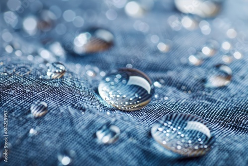 Fototapeta premium A close up of a blue fabric with water droplets on it. The droplets are small and clear, and they are scattered all over the fabric. Concept of calmness and tranquility