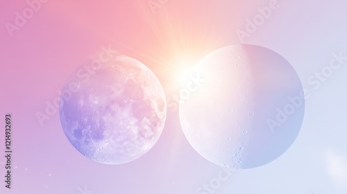 © Putt_Sanplee, Obraz premium A close-up of a bright sun and a glowing moon sharing the same sky, with their outlines visible against a soft gradient of twilight blue and lavender.