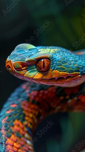 Fototapeta premium A close-up of a brightly colored snake with a green, blue, orange, and black...