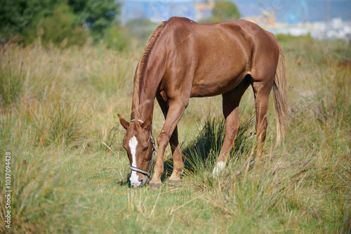 © sandsun, Obraz premium A close-up of a brown horse grazing on green grass, highlighting its head and front legs, with a chain attached, set in a peaceful rural environment