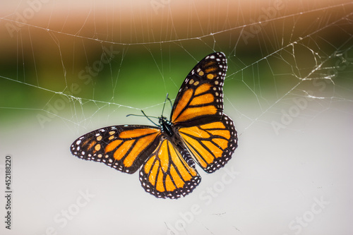 © Jaden, Fototapeta premium A close up of a butterfly trapped in a spider web