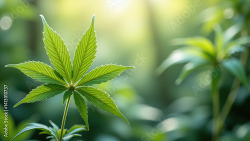 © Tameem, Obraz premium A close-up of a cannabis plant leaf with bright sunlight streaming through.