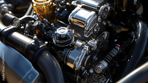 © Winyou, Obraz premium A close up of a car engine with a gold colored cap