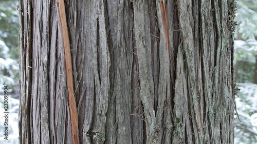 © Jeff Pittman, Obraz premium A close up of a cedar tree, with winter forest in the background.