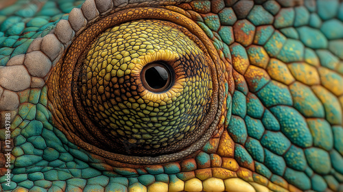 © Ramses, Obraz premium A close-up of a chameleon’s skin and eye reveals vivid scales, intricate textures, and mesmerizing color transitions in stunning natural detail.